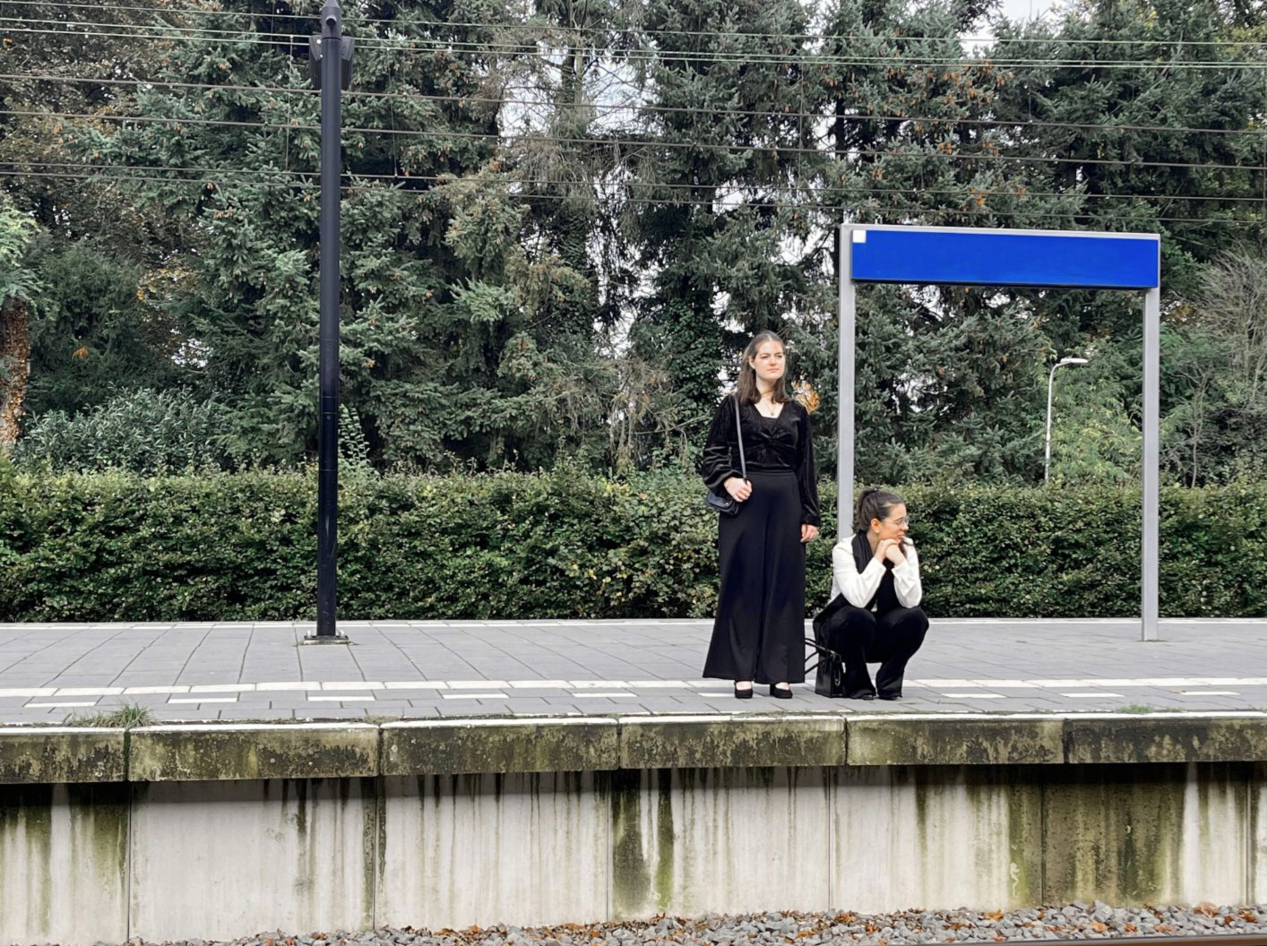 Stella en Mindy komen van de begrafenis van een vriendin van vroeger. Ze staan op het station. De trein komt voorlopig nog niet en het ongemak tussen de twee neemt toe, al doen ze beiden hun best dat te verbergen. Ooit werkten ze samen in een bar, maar waarom is het toch zo lang geleden dat ze elkaar spraken? Onder de schijnbaar onbelangrijke gesprekken over de bloemen, de muziek, een baggy legging, volle melk in cappuccino en het hebben van de juiste billen sluimeren grotere thema’s zoals ouder worden, contact maken, vergankelijkheid, omgaan met de dood en met teleurstellingen.